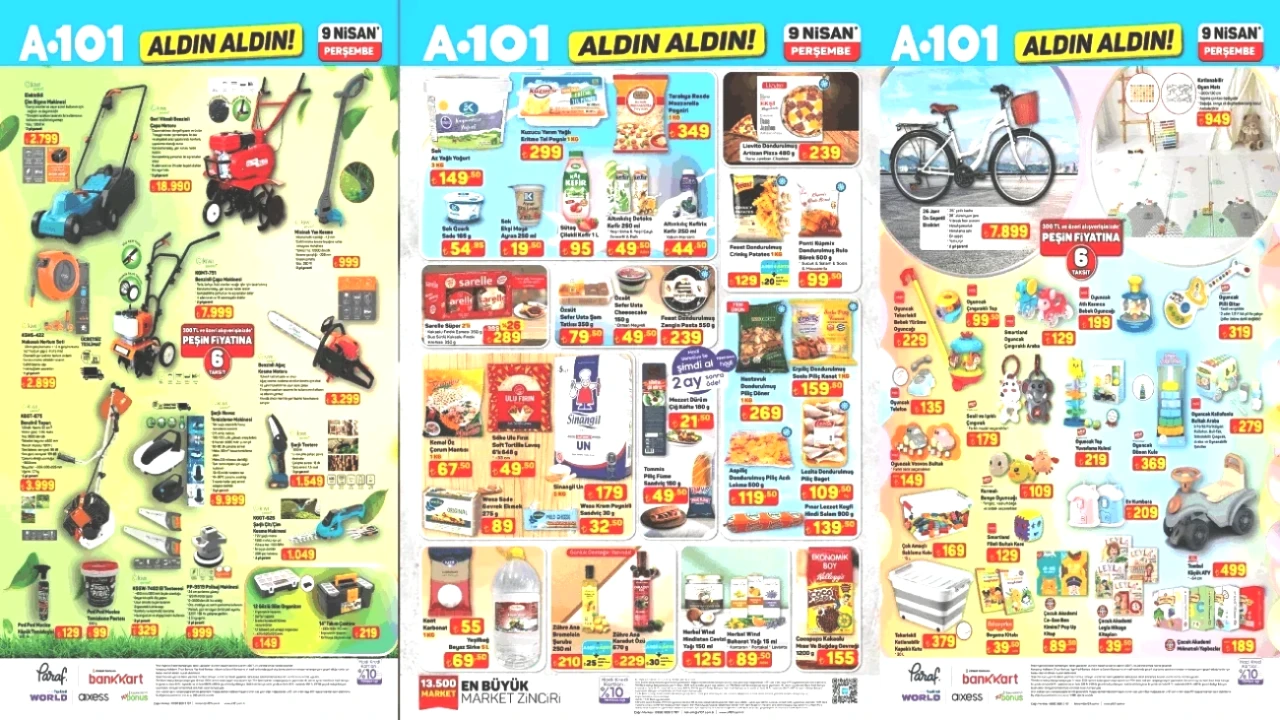 9 Nisan Perşembe günü A101 marketlerinde yeni indirimli ürünler kullanıcıların beğenisine sunuluyor. Türkiye'nin en popüler perakende zincirlerinden biri olan A101, her hafta perşembe günleri özel bir katalog hazırlıyor. Bu hafta, gıda ve temizlik malzemeleri dışında, elektrikli çim biçme makinesi, halı ve koltuk yıkama makinesi, plastik koltuk ile elektrikli ve benzinli moped gibi çeşitli yeni ürünler tanıtıldı. İşte 9 Nisan Perşembe günü için beklenen A101 aktüel ürünler kataloğu..